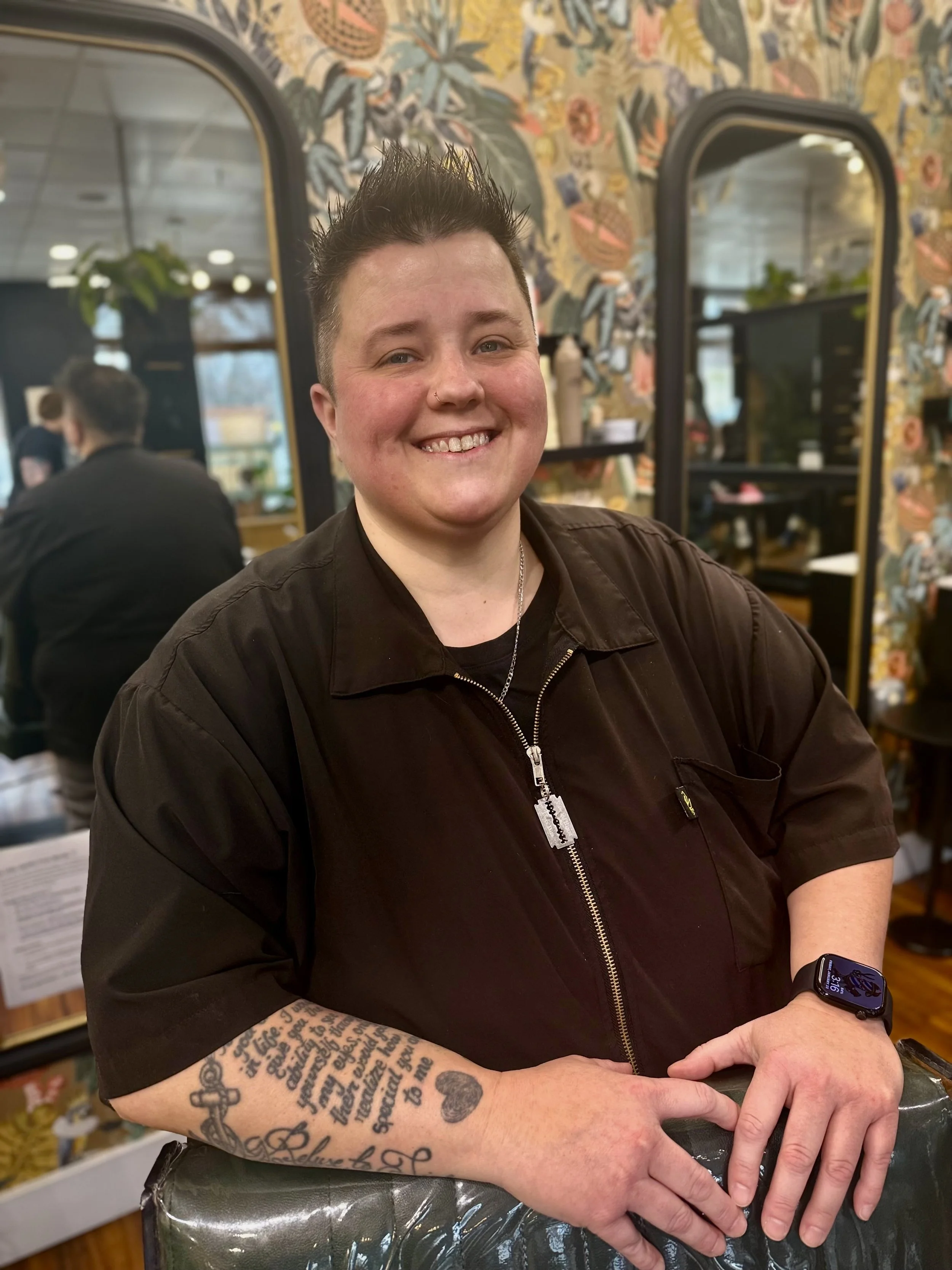 Madi (they/them) graduated from the College of Hair Design in 2023 and has developed their skills with skin fades and taper cuts. Primarily focuses on shorter haircuts, especially gender affirming. They also offer an array of grooming services such as straight razor shaves. Madi brings a relaxed atmosphere where every client feels valued.